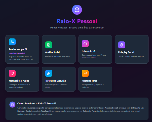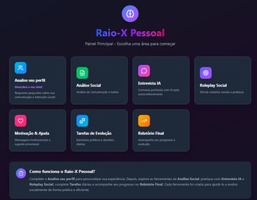 Parabéns! Você acaba de acessar o Raio-X Pessoal Prime, o aplicativo criado para analisar sua personalidade, comunicação, energia social e te ajudar a evoluir de forma prática, sincera e totalmente personalizada.